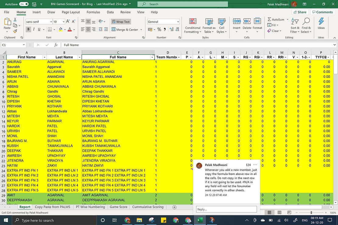 The sheet named Report is developed such that it will check for the FULL NAME of the member in the sheet named Copy Paste from PALMS and map for the values against that member’s name.