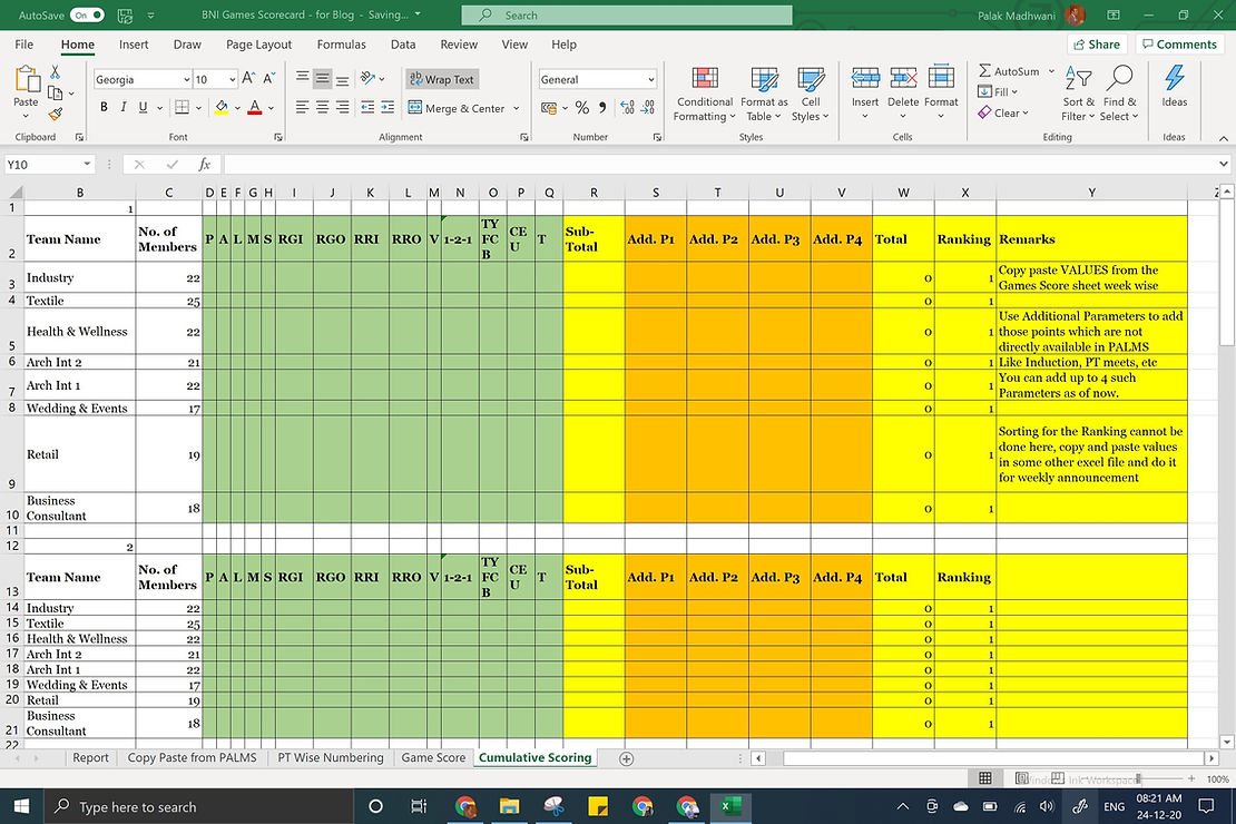 You may want to add points for certain parameters like weekly meetings done by the power team, or inductions done by the power team, and so on. This is very simple, you can add up to 4 additional parameters in the Cumulative Scoring sheet. If you want to add more then you also you can do but you will have to slightly modify the Total and Ranking formula accordingly.