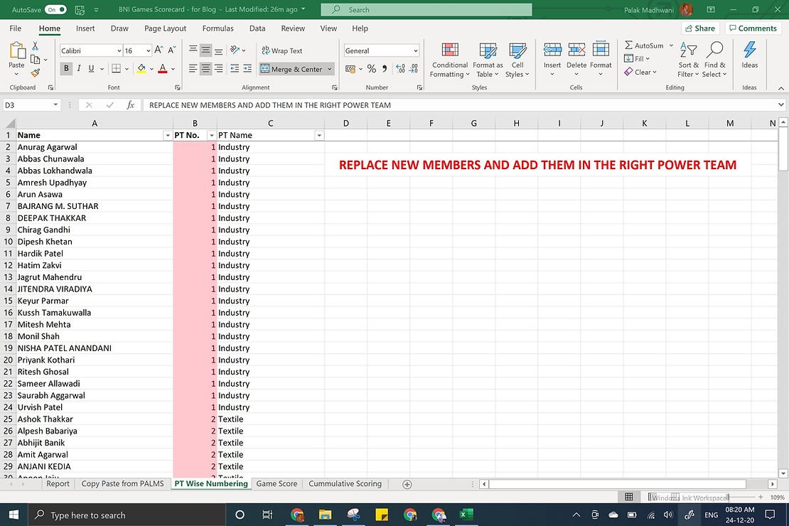 I have kept space for the addition of 5 more members in each of the power team. If you want to use a lesser number of members then delete the values from the PALMS part only in the REPORT sheet. Let the extra rows of members be as it is.