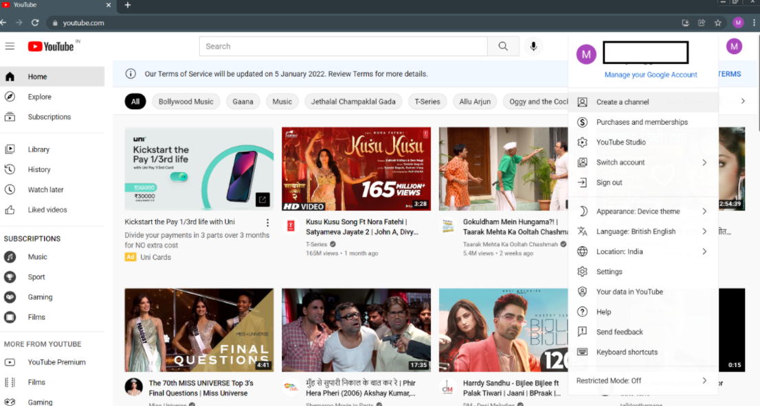 Step 2: click on your profile picture on the top right corner, it will open a drop-down menu, from there you can create a Channel on YouTube.