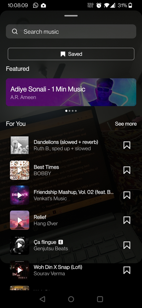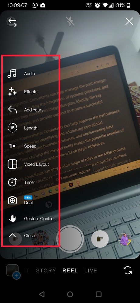 There is a tool menu on the left when you record a reel. To search for a song in our music collection, tap audio. You have the option of playing a particular music segment.