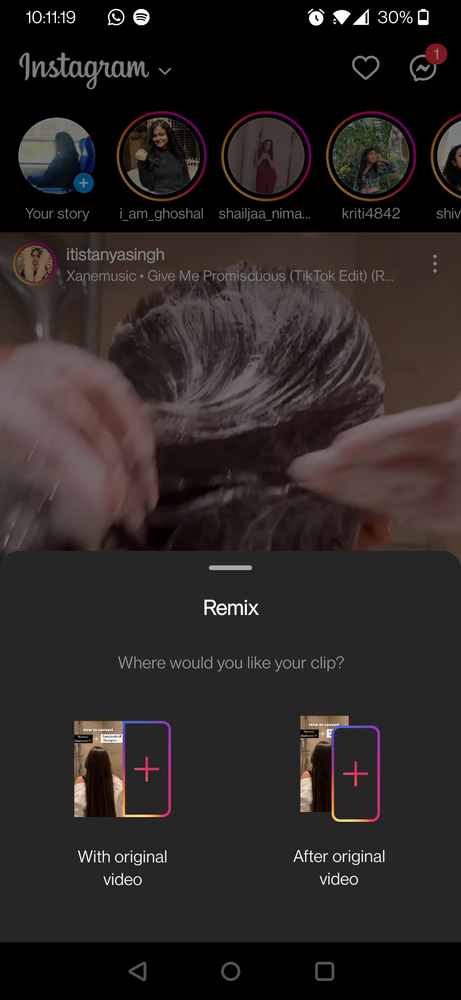 You may choose whether you want your clip to display before or after the original video by tapping Remix this reel.